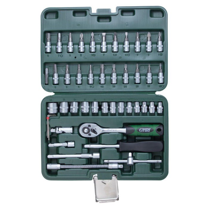 Наборы GRAD - линейка для бытового использования. Наборы подходят как для выполнения несложного автомобильного ремонта, так и для бытового применения. Инструменты изготовлены из прочной инструментальной стали и имеют трехслойное покрытие (Nickel X2 + Chrome). Для комфортного хранения и транспортировки, наборы поставляются в кейсе, который изготовлен из прочного АБС-пластика с металлическими замками.